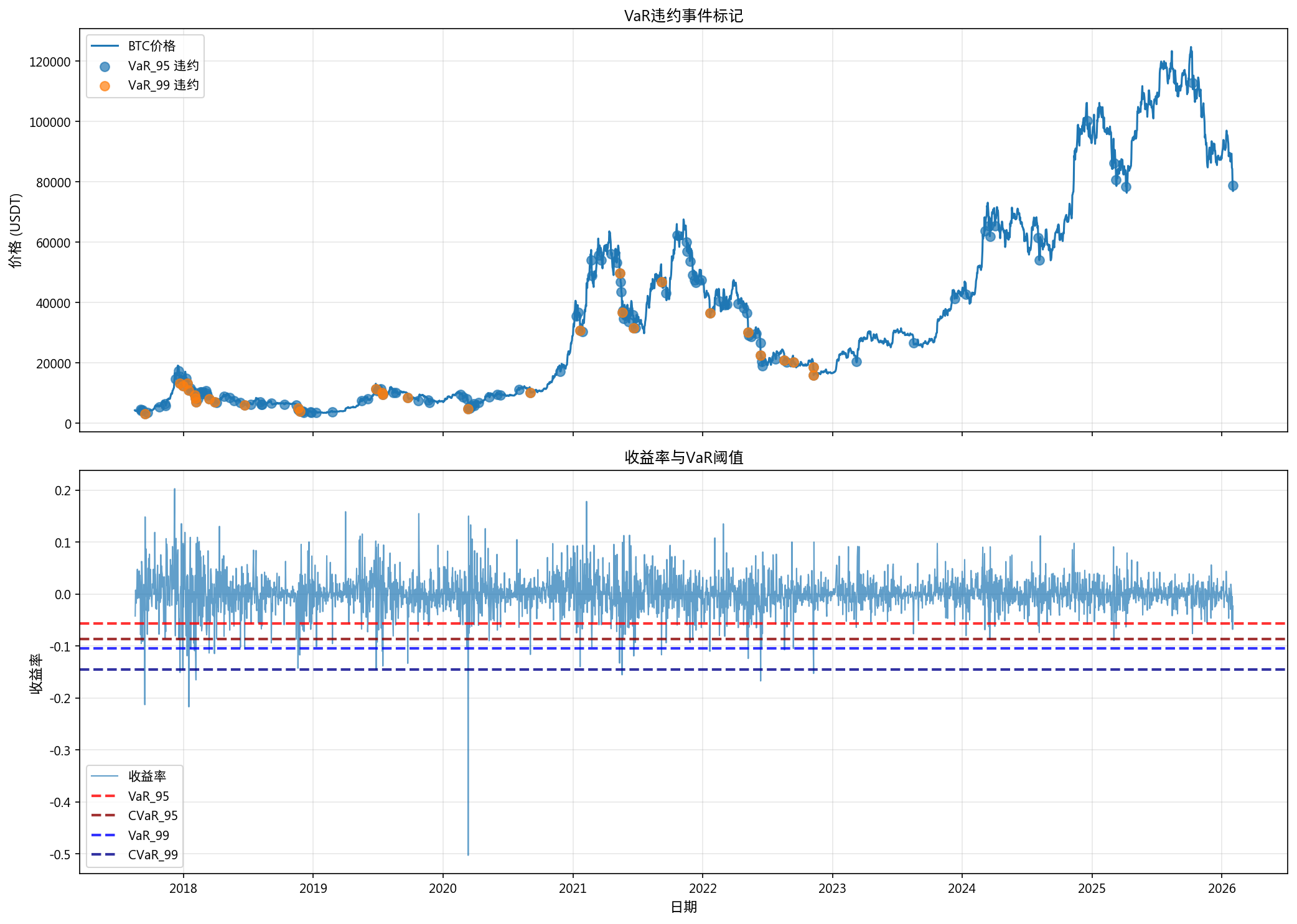 新增分析模块: - microstructure: 市场微观结构分析 (Roll价差, VPIN, Kyle's Lambda) - intraday_patterns: 日内模式分析 (U型曲线, 三时区对比) - scaling_laws: 统计标度律 (15尺度波动率标度, R²=0.9996) - multi_scale_vol: 多尺度已实现波动率 (HAR-RV模型) - entropy_analysis: 信息熵分析 - extreme_value: 极端值与尾部风险 (GEV/GPD, VaR回测) - cross_timeframe: 跨时间尺度关联分析 - momentum_reversion: 动量与均值回归检验 现有模块增强: - hurst_analysis: 扩展至15个时间尺度,新增Hurst vs log(Δt)标度图 - fft_analysis: 扩展至15个粒度,支持瀑布图 - returns/acf/volatility/patterns/anomaly/fractal: 多尺度增强 研究报告更新: - 新增第16章: 基于全量数据的深度规律挖掘 (15尺度综合) - 完善第17章: 价格推演添加实际案例 (2020-2021牛市, 2022熊市等) - 新增16.10节: 可监控的实证指标与预警信号 - 添加VPIN/波动率/Hurst等指标的实时监控阈值和案例 数据覆盖: 全部15个K线粒度 (1m~1mo), 440万条记录 关键发现: Hurst随尺度单调递增 (1m:0.53→1mo:0.72), 极端风险不对称 Co-Authored-By: Claude Opus 4.5 <noreply@anthropic.com>